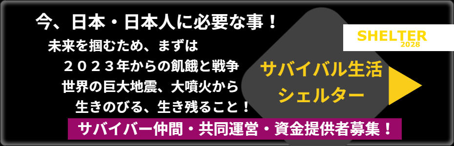 当サイト(シェルター・サバイバルライフ)は、2020年から世界に蔓延したコロナを切っ掛けに、2022年着々と進行する世界戦略の支配下の中で、周囲から徐々に1つ1つ国家として選択肢・決定権を減らす戦略で迫りくる日本の国家としての存亡危機、日本人の存亡の危機を中心に、信頼を失いつつある嘘と虚言発言を繰り返す政府・官公庁から真摯に向き合い、気づいた国民から徐々に脱却し、新しい UNITY(団結)を創造、サバイバルを生き抜く為に立ち上がり2023年から更に深まり始まる危機へ結束するJAPANESE SOUL(大和魂)YAMATO TEAMsです。