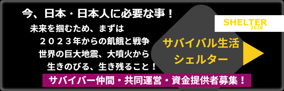 当サイト(シェルター・サバイバルライフ)は、2020年から世界に蔓延したコロナを切っ掛けに、2022年着々と進行する世界戦略の支配下の中で、周囲から徐々に1つ1つ国家として選択肢・決定権を減らす戦略で迫りくる日本の国家としての存亡危機、日本人の存亡の危機を中心に、信頼を失いつつある嘘と虚言発言を繰り返す政府・官公庁から真摯に向き合い、気づいた国民から徐々に脱却し、新しい UNITY(団結)を創造、サバイバルを生き抜く為に立ち上がり2023年から更に深まり始まる危機へ結束するJAPANESE SOUL(大和魂)YAMATO TEAMsです。